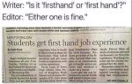 First hand should have a hyphen (first-hand) but putting a hyphen between "hand" and "job" could result in the description of an activity with which the editor may be familiar? And this is an editor.