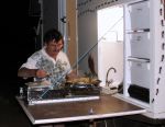 We find that our outside fold down table with storage, light, water and gas cooker is a winner.